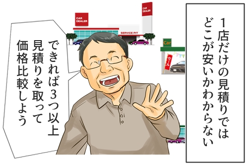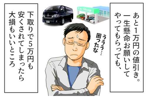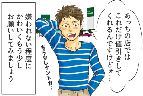 と、他のお店の見積もりを実際に見せることで、条件さえ合うのなら買ってくれるんだと思わせるのも大切。面倒でも他のお店に足を運んで、同じようなオプション条件で見積もりを取って、できれば3店以上で比較するようにしてみてください。