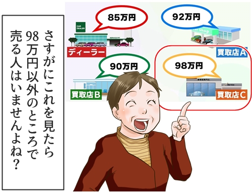 たとえばディーラーが85万円。買取店Aが92万円、買取店Bが90万円、そして買取店Cが98万円の査定額が出た。