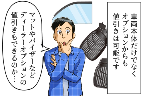 サンルーフや本革シートなど「メーカーオプション」からの値引きはありませんが、販売会社で設定されたディーラーオプションは、いくつかつけることで値引き額が増えることもあります。たとえば、